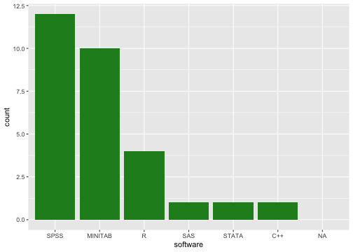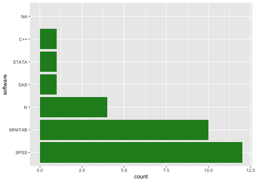 class: center, middle, inverse, title-slide # STA 517 3.0 Programming and Statistical Computing with R ## Welcome! ### Dr Thiyanga Talagala ### 2020-08-16 --- background-image: url('me.png') background-position: center background-size: cover --- background-image: url('courseweb_msc.png') background-position: center background-size: cover --- background-image: url('courseweb.png') background-position: center background-size: cover --- background-image: url('book.png') background-position: center background-size: contain --- background-image: url('RLadies.jpg') background-position: center background-size: cover # Toulouse, France, June-2019 --- background-image: url('rl1.png') background-position: center background-size: cover ## @RLadiesColombo --- background-image: url('rl2.png') background-position: center background-size: cover ## @RLadiesColombo --- background-image: url('scs.png') background-position: center background-size: cover # https://scs-fas-sjp.netlify.app/ --- background-image: url('classoverview.png') background-position: center background-size: cover # Class overview - precourse survey --- # Class overview - precourse survey ```r software <- c("R", "Python", "MINITAB", "SPSS", "C++", "STATA", "SAS") count <- c(4, 0, 10, 12, 1, 1, 1) df <- data.frame(software, count) df ``` ``` software count 1 R 4 2 Python 0 3 MINITAB 10 4 SPSS 12 5 C++ 1 6 STATA 1 7 SAS 1 ``` --- # Class overview - precourse survey ```r library(ggplot2) p1 <- ggplot(data=df, aes(x=software, y=count)) + geom_bar(stat="identity") p1 ``` <!-- --> --- # Class overview - precourse survey ```r df$software <- factor(df$software, levels=c("SPSS", "MINITAB", "R", "SAS", "STATA", "C++", "Python")) p1 <- ggplot(data=df, aes(x=software, y=count)) + geom_bar(stat="identity") p1 ``` <!-- --> --- # Class overview - precourse survey ```r df$software <- factor(df$software, levels=c("SPSS", "MINITAB", "R", "SAS", "STATA", "C++", "")) p1 <- ggplot(data=df, aes(x=software, y=count)) + geom_bar(stat="identity", fill="forestgreen") p1 ``` <!-- --> --- # Class overview - precourse survey ```r df$software <- factor(df$software, levels=c("SPSS", "MINITAB", "R", "SAS", "STATA", "C++", "")) p1 <- p1 + coord_flip() p1 ``` <!-- --> --- # Class overview - precourse survey ```r library(plotly) ggplotly(p1) ```