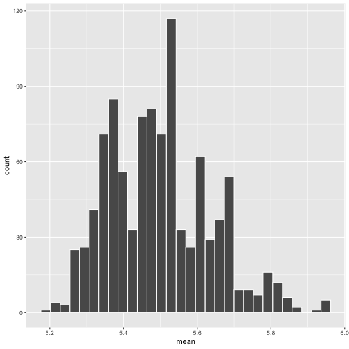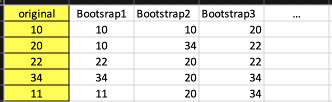 class: center, middle, inverse, title-slide # STA 517 3.0 Programming and Statistical Computing with R ## An Introduction to the Bootstrap Method ### Dr Thiyanga Talagala ### 22 November 2020 --- <!--https://statisticsbyjim.com/hypothesis-testing/bootstrapping/--> # What is a bootstrap? - Bootstrap is a method of inference. - Bradley Efron first introduced this approach in 1979. - Link to his original paper is [here](https://projecteuclid.org/euclid.aos/1176344552).  - Bootstrapping is a computer-intensive procedure. --- # Applications - Estimate the standard error of any statistic and to obtain a confidence interval (CI) for it. - This is useful when CI doesn't have a closed form, or it has a very complicated one. - Hypothesis testing - Bootstrap sampling in regression, etc. ## Three forms of bootstrapping - Nonparametric (resampling) - Semiparametric (adding noise) - Parametric (simulation) <!--https://online.stat.psu.edu/stat555/node/119/--> <!--There are three forms of bootstrapping which differ primarily in how the population is estimated. Most people who have heard of bootstrapping have only heard of the so-called nonparametric or resampling bootstrap.--> --- ## Bootstrapping Resamples - The bootstrap sample is the same size as the original sample data. - As a result, some observations will be represented multiple times in the bootstrap sample while others will not be selected at all. ## Example of Bootstrap Samples  - Bootstrapping does not take new observations from the population. - It treats the original sample as a proxy for the real population and then draws random samples from it. - Consequently, the central assumption for bootstrapping is that the original sample accurately represents the actual population. --- # Steps 1. Take a sample from population. This is called the **original sample**. Suppose the sample size is `\(n\)`. 2. Draw a sample from the original sample data with replacement with size `\(n\)` and repeat this step `\(N\)` times. 3. Compute the statistic of `\(\theta\)` for each Bootstrap Sample, and there will be totally `\(N\)` estimates of `\(\theta\)`. 4. Construct a sampling distribution with these `\(N\)` Bootstrap statistics and use it to make further statistical inference. ---  --- ## Differences between Bootstrapping and Traditional Inference Methods - how they estimate sampling distributions - "The traditional approach also uses theory to tell what the sampling distribution should look like, but the results fall apart if the assumptions of the theory are not met. The bootstrapping method, on the other hand, takes the original sample data and then resamples it to create many bootstrap samples." > source: towards data science. <!--https://towardsdatascience.com/bootstrapping-statistics-what-it-is-and-why-its-used-e2fa29577307#:~:text=The%20traditional%20approach%20also%20uses,create%20many%20%5Bsimulated%5D%20samples.--> --- ## Example 1 <!--http://bcs.whfreeman.com/webpub/statistics/ips9e/9781319013387/companionchapters/companionchapter16.pdf--> Height of randomly selected individuals ```r height <- c(5.2, 6.1, 5.5, 5.4, 5.3) height ``` ``` [1] 5.2 6.1 5.5 5.4 5.3 ``` 1. Construct 1000 bootstrap samples. 2. Calculate the sample mean for each of the resamples. 3. Make a histogram of the means of the 1000 bootstrap samples. This is the bootstrap distribution. 4. Calculate the bootstrap standard error. --- ## Example 1 (cont.) Help: `$$\bar{X*} = \frac{1}{N}\sum_{i=1}^N\bar{x}_{i}^{bootstrap}$$` `$$se(\bar{X*}) =\sqrt{\frac{1}{N-1}\sum_{i=1}^N (\bar{x}_{i}^{bootstrap} - \bar{X*})^2}$$` The bootstrap standard error, of a statistic is the standard deviation of the bootstrap distribution of that statistic. --- ## Classical confidence interval `$$[\bar{x}- t_{\alpha/2, n-1}se(\bar{x}), \bar{x}- t_{\alpha/2, n-1}se(\bar{x})]$$` ## Confidence intervals via bootstrap - `boot` package can generate bootstrap samples. - Step 1: To use the `boot` function for drawing samples, you need a function to compute the statistic of interest. ```r samplemean <- function(data, indices) { return(mean(data[indices])) } ``` It should have at least two arguments: i) `data`: the original data ii) a vector containing `indices`: frequencies or weights which define the bootstrap sample. `data[indices]` Creates the bootstrap sample (i.e., subset the provided data by the “indices” parameter). “indices” is automatically provided by the “boot” function; this is the sampling with replacement portion of bootstrapping. --- ## Confidence intervals via bootstrap (cont.) Step 2: Conduct the bootstrapping ```r library(boot) result <- boot(data = height, statistic = samplemean, R = 1000) result ``` ``` ORDINARY NONPARAMETRIC BOOTSTRAP Call: boot(data = height, statistic = samplemean, R = 1000) Bootstrap Statistics : original bias std. error t1* 5.5 -0.00226 0.1391239 ``` <!--http://people.tamu.edu/~alawing/materials/ESSM689/Btutorial.pdf--> --- ## View some calculated statistics of boot object .pull-left[ **Bootstrap sample means** ```r result$t ``` ``` [,1] [1,] 5.38 [2,] 5.58 [3,] 5.50 [4,] 5.36 [5,] 5.50 [6,] 5.20 [7,] 5.38 [8,] 5.44 [9,] 5.48 [10,] 5.72 [11,] 5.26 [12,] 5.60 [13,] 5.66 [14,] 5.42 [15,] 5.34 [16,] 5.54 [17,] 5.38 [18,] 5.34 [19,] 5.30 [20,] 5.62 [21,] 5.40 [22,] 5.40 [23,] 5.40 [24,] 5.66 [25,] 5.50 [26,] 5.52 [27,] 5.52 [28,] 5.42 [29,] 5.28 [30,] 5.70 [31,] 5.52 [32,] 5.48 [33,] 5.42 [34,] 5.68 [35,] 5.52 [36,] 5.38 [37,] 5.42 [38,] 5.46 [39,] 5.42 [40,] 5.50 [41,] 5.52 [42,] 5.58 [43,] 5.46 [44,] 5.26 [45,] 5.48 [46,] 5.34 [47,] 5.52 [48,] 5.60 [49,] 5.52 [50,] 5.48 [51,] 5.64 [52,] 5.52 [53,] 5.48 [54,] 5.46 [55,] 5.62 [56,] 5.34 [57,] 5.80 [58,] 5.26 [59,] 5.36 [60,] 5.40 [61,] 5.56 [62,] 5.36 [63,] 5.52 [64,] 5.64 [65,] 5.54 [66,] 5.66 [67,] 5.62 [68,] 5.54 [69,] 5.56 [70,] 5.50 [71,] 5.34 [72,] 5.54 [73,] 5.48 [74,] 5.40 [75,] 5.80 [76,] 5.60 [77,] 5.62 [78,] 5.32 [79,] 5.40 [80,] 5.52 [81,] 5.56 [82,] 5.42 [83,] 5.72 [84,] 5.50 [85,] 5.34 [86,] 5.48 [87,] 5