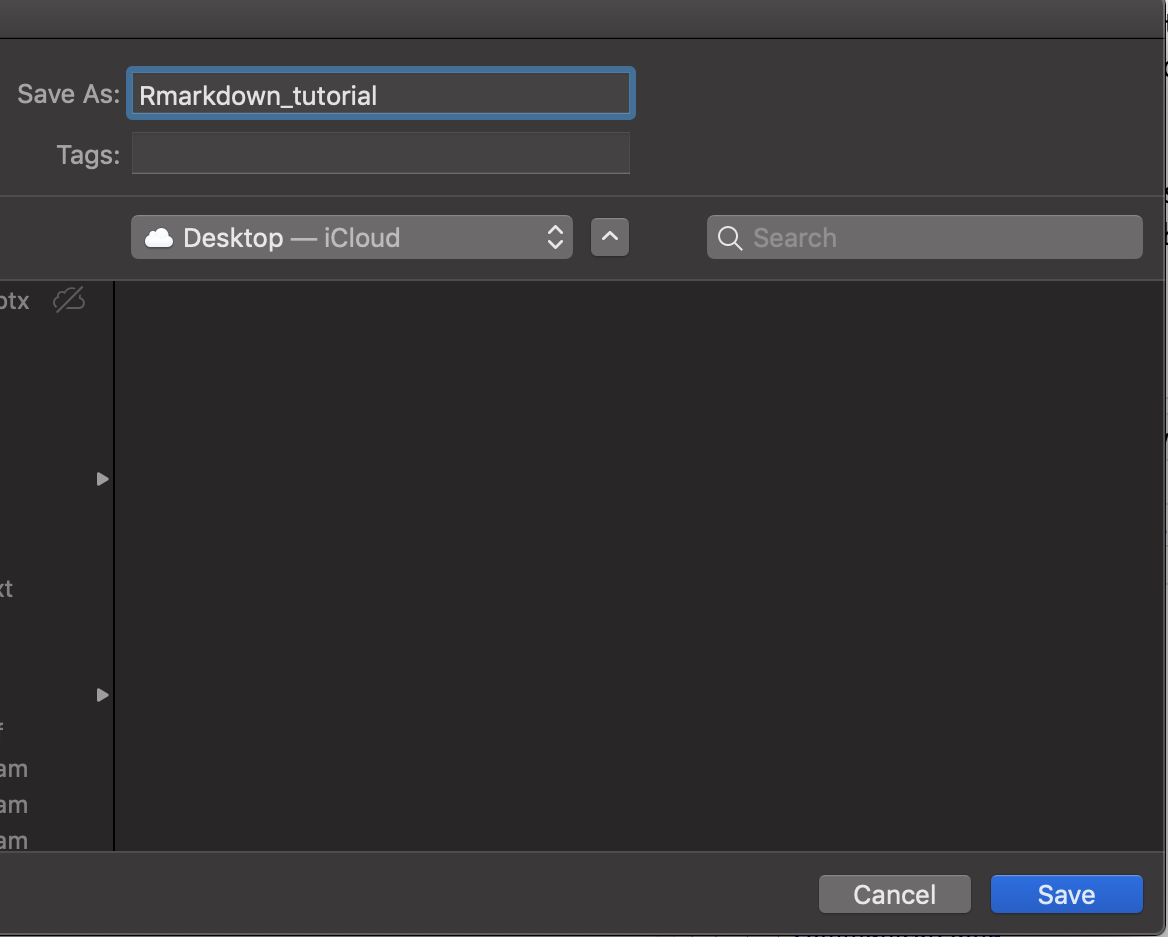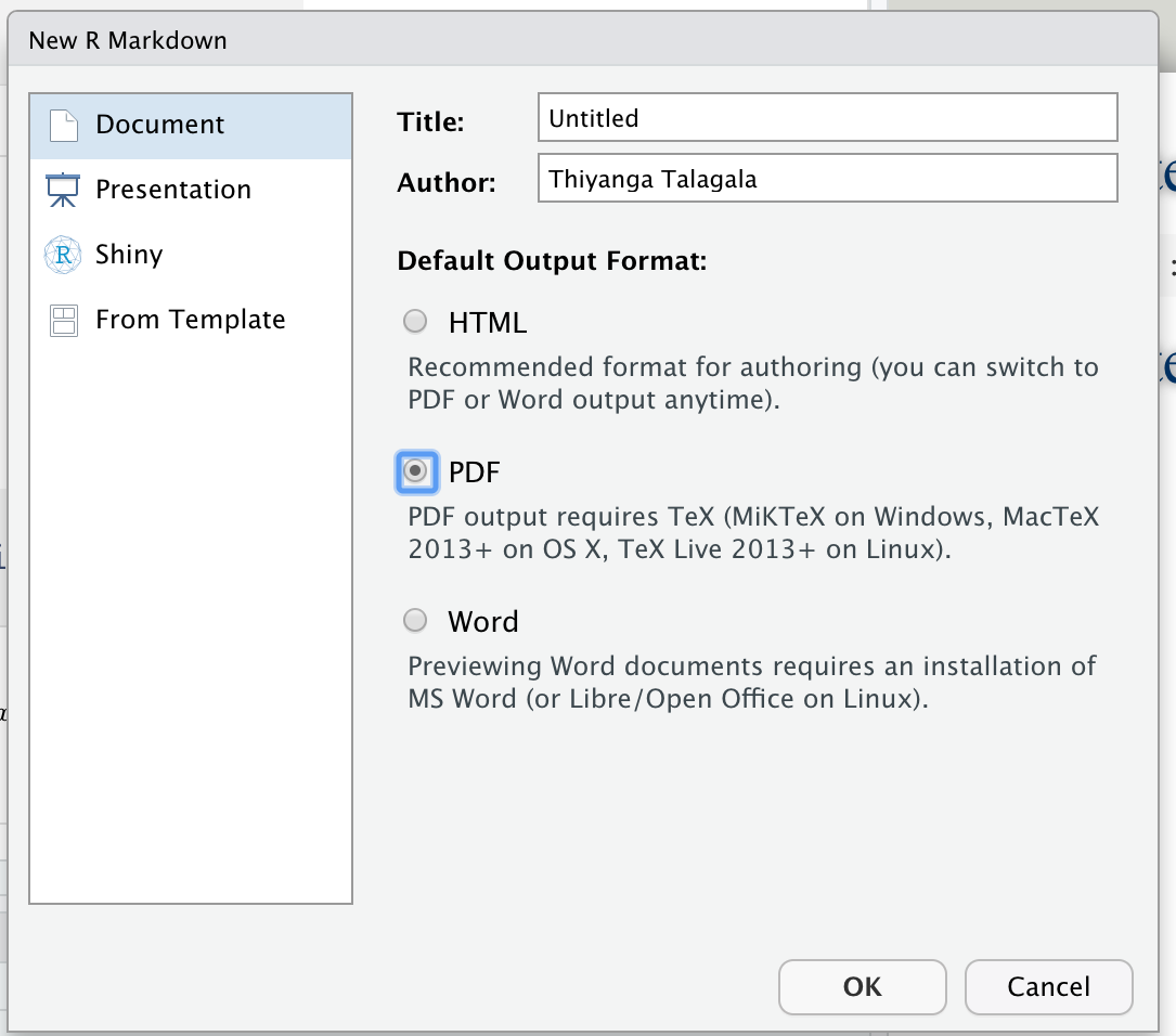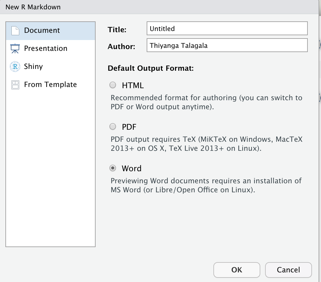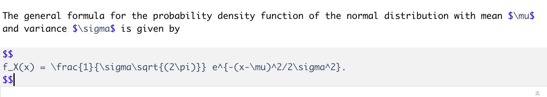 class: center, middle, inverse, title-slide # STA 517 3.0 Programming and Statistical Computing with R ## Reproducible Reports with R-Markdown ### Dr Thiyanga Talagala ### 27 September 2020 --- background-image: url(workflowds_communication.png) background-position: center background-size: contain # Data Science Workflow: Communicate --- # Necessary packages ## Installation ```r install.packages(knitr) install.packages(rmarkdown) ``` <img src="knitrhex.png" alt="knitrhex" width="300"/> <img src="rmarkdown.png" alt="rmarkdown" width="250"/> --- # Introduction to R Markdown - R Markdown is a file format for making dynamic documents with R. - R Markdown allows you to organize your code, outputs, content and commentary in one place. - These documents are self-contained and fully reproducible which makes it very easy to share. - R Markdown document is written in markdown. - Markdown is one of the world's most popular markup language. - R Markdown (in R) - Jupyter Notebooks (in Python) --- # Advantages 1. For .bold[.green[communicating]] to .bold[.red[decision makers]], who want to focus on the results and conclusions, not the code behind the analysis. 1. For .bold[.green[collaborating]] with other .bold[.red[data scientists]], who are interested in both your conclusions, and how you reached them (i.e. the codes that you used to take the outputs). 1. As an environment in which to do data science, as a modern day lab notebook where you can capture not only .bold[.blue[what you did]], but also .bold[.blue[what you were thinking]]. *From R for Data Science by Hadley Wickham and Grrett Grolemud.* --- class: duke-orange, center, middle # Your first rmarkdown document. --- background-image: url(rmarkdown_step1.png) background-position: center background-size: contain --- background-image: url(rmarkdown_step2.png) background-position: center background-size: contain --- background-image: url(rmarkdown_step2_1.png) background-position: center background-size: contain --- background-image: url(rmarkdown_step3.png) background-position: center background-size: contain class: center, middle --- background-image: url(componentsrmd.png) background-position: center background-size: contain class: center, middle --- background-image: url(rmarkdown_step4.png) background-position: center background-size: contain class: center, middle --- # Select a folder to save the document  --- # Give a name to the document  --- background-image: url(rmarkdown_step5.png) background-position: center background-size: contain class: center, middle --- background-image: url(rmarkdown_step6.png) background-position: center background-size: contain class: center, middle --- background-image: url(rmarkdown_step7.png) background-position: center background-size: contain class: center, middle --- class: duke-orange, center, middle # Edit .rmd file to include your content --- # Change header .pull-left[ **Code** ```r # Header 1 ## Header 2 ### Header 3 ``` ] .pull-right[ **Output** # Header 1 ## Header 2 ### Header 3 ] --- # Add content .pull-left[ **Code** ```r # Header 1 This is section 1. ## Header 2 This is section 1.2 ### Header 3 This is section 1.2.1 ``` ] .pull-right[ **Output** # Header 1 This is section 1. ## Header 2 This is section 1.2 ### Header 3 This is section 1.2.1 ] --- # Add R codes .pull-left[ **Code** ```r # Header 1 This is section 1. ## Header 2 This is section 1.2 ### Header 3 This is section 1.2.1 ``` <img src="codechunk_example.png" alt="codechunk_example" width="100"/> ] .pull-right[ **Output** # Header 1 This is section 1. ## Header 2 This is section 1.2 ### Header 3 This is section 1.2.1 ```r rnorm(2) ``` ``` ## [1] -0.8535162 0.5664824 ``` ] --- # Chunk options * `eval = FALSE` - prevents the code from being evaluated * `include = FALSE` - runs the code but doesn't show it in the final document * `echo = FALSE` - prevents the code but not the results from appearing * `message = FALSE` - prevents messages from appearing in the finished file * `results = "hide"` - hides the printed output * `error = TRUE` - causes the render to continue even if the code returns an error --- # Text formatting .pull-left[ ## Code <img src="text.png" alt="text" width="300"/> ] .pull-right[ ## Output *M1: This text is in italics.* _M2: This is also italics._ **M3: This text is in bold.** __M4: This is also bold.__ ~~This text is strikethrough.~~ ] --- # Mathematical Equations **The code:**  **Output:** The general formula for the probability density function of the normal distribution with mean `\(\mu\)` and variance `\(\sigma\)` is given by $$ f_X(x) = \frac{1}{\sigma\sqrt{(2\pi)}} e^{-(x-\mu)^2/2\sigma^2}. $$ ## How to type Greek letters? Please read my blog post here: https://thiyanga.netlify.app/post/greekletters/ --- ### Generate PDF and WORD documents .pull-left[ **Create a PDF document**  Requires (MiKTex on Windows, MacTex 2013+ on OS X, Tex Live 2013+ on Linux) OR Install tinytex in R. Type the following code on R Console. ```r tinytex::install_tinytex() ``` ] .pull-right[ **Create a Word document**  Requires an installation of MS Word. ] --- # R Markdown Demonstration > Download [Rmarkdown_practical_lesson1.Rmd](/rscripts/rmarkdown_labwork/Rmarkdown_practical_lesson1.Rmd) > Download [sampleimage.jpg](/rscripts/rmarkdown_labwork/sampleimage.jpg) > Before running the file `Rmarkdown_practical_lesson1.Rmd`, save `Rmarkdown_practical_lesson1.Rmd` and `sampleimage.jpg` into your current working directory. > Follow the video lecture for instructions. --- class: center, middle Slides available at: https://thiyanga.netlify.app/courses/rmsc2020/contentr/ All rights reserved by [Thiyanga S. Talagala](https://thiyanga.netlify.com/)